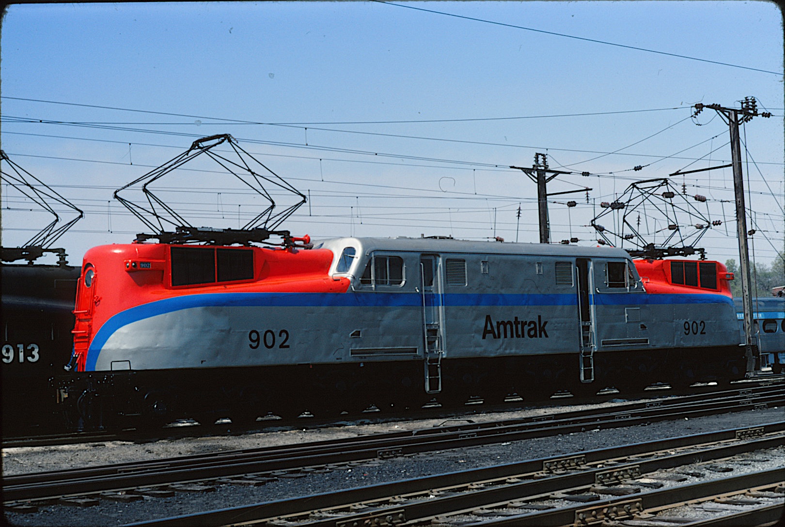 By mid-day, we were back at Ivy City and treated to the surprise of trip. Freshly painted Amtrak GG-1 #902 and E8A #235 were on-hand for the official introduction of the National Passenger Railroad's new colors; the E-unit was parked in the roundhouse. The unveiling had been scheduled for the following Monday, May 1st.  |