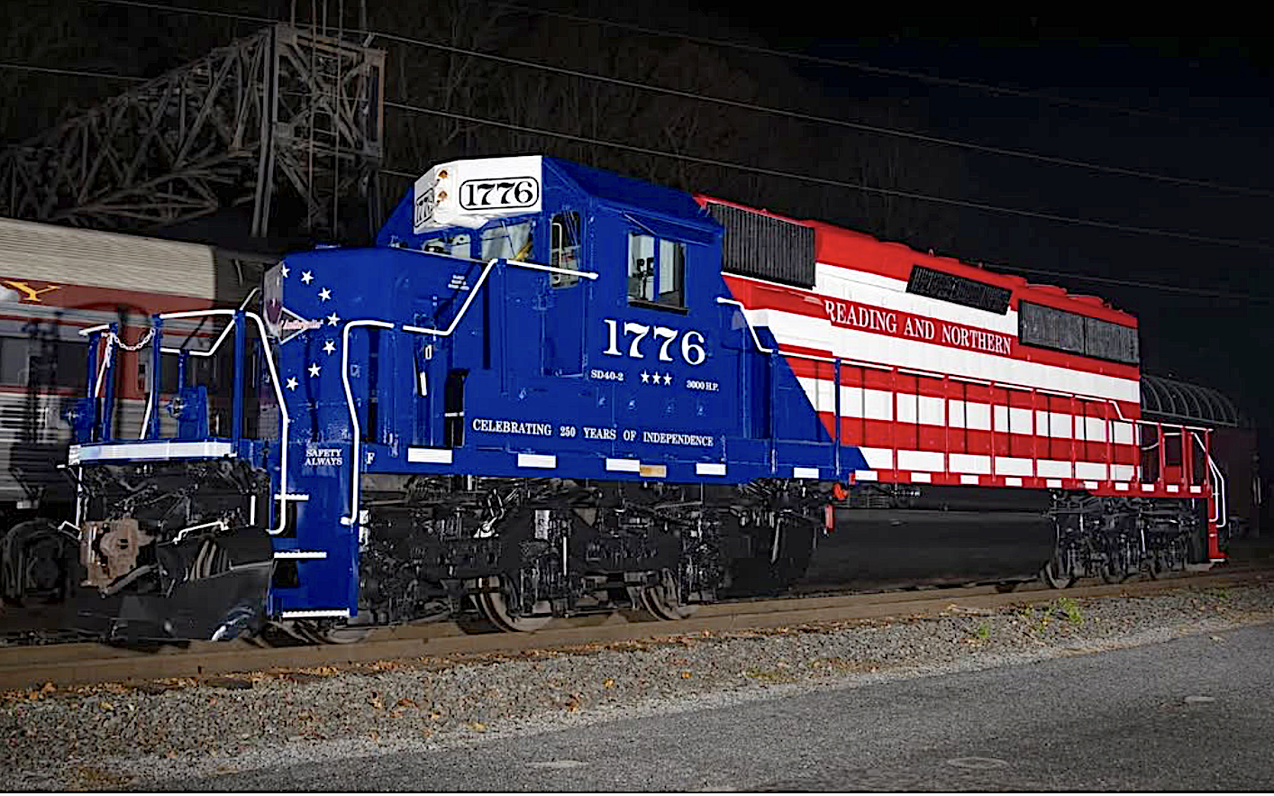 For months rumors have been circulating with regards to the possibility of an American Freedom Train 2026 similar to the 1947 and 1976 AFTs which toured U.S. cities, large and small. The following link may help you find answers to your questions: 250th Some olders fans might recall that during the Bicentennial years (1974-1977) more than 250 locomotives sported some type of patriotic paint scheme; Seaboard Coast Line U36B #1776 was the first to mark the very special occasion, the year was 1970. For the 2026 celebration Pennsylvania & Southern & #16 appears to alreday hold that distinction. Of course, many observers are wondering to what degree will today's railroads and industry participate -- Only time will tell. Nonetheless with your assistance, we will attempt to document each new Semiquincentennial locomotive as it is introduced. |