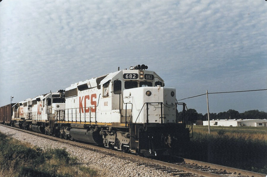 The following information comes from the May 1988 issue of The Crow, the monthly newsletter of the Kansas City Southern Historical Society, which was edited by Lowell McManus: -- NEW LOCOMOTIVE LIVERY? KCS SD40-2 652 has been repainted into the following new experimental paint scheme: The basic color is a medium gray, described by one observer as "not nearly as dark as SP's." The front of the short hood is tiled from top to bottom with yellow chevron stripes, broader than those formerly used by MoPac. The big red "KCS" lettering remains on the side of the long hood, as does the yellow stripe along the side of the frame. The trucks and fuel tank are black. The number is in red below the cab window, and the octagon herald is absent from the locomotive. The repainted unit, called The Gray Ghost by some employees, is now in regular use." The Crow also reported in December 1988: A NEW, IMPROVED WHITE. KCSHS member Louis Marre (coauthor of Diesel Spotter's Guide Update) sends us the following astute observations on the current state of KCS color schemes: "...they are painting at a fairly steady rate, and in the current variant of the white scheme. The sharp-eyed will note that the color is changed slightly, and the painting method is much altered: now the acrylic 'pearl gray' is applied, then the red stencils, and then a clear overcoat is added, making washing much more effective. An additional carwash-type facility has been added...in Shreveport, and units are being hand washed on a regular basis at Neosho and Heavener as well. All this means that the white scheme should hold up better and look better while on the road if this whole program is followed." We have independent reports that GP38-2 4006 was painted in the experimental dark gray solely to exhaust the existing supply of the expensive gray paint. The new acrylic painting process was apparently pioneered on gray SD40-2 652, and the employees who work with it and wash it regularly in Neosho are highly impressed with its durability. The new white should be as good. Other reference sources: Extra 2200 South (April/May/June 1991 issue) and KCS Roster (2003) compiled by F.L. (Dutch) Schultz, jr. Additional data provided by Paul F. De Luca, Steve Gerbracht, David Hawkins, Zack Hilton, Bryan Jones, and David W. Read.
