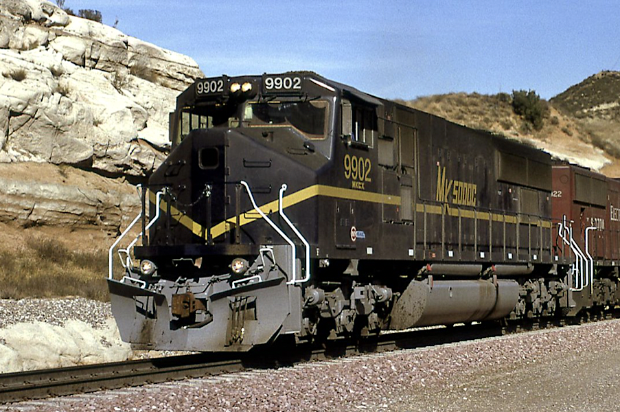 ![]() MPI 9902 with a UP coal train at Cajon, CA in January 1997 Joseph Blackwell photo |
