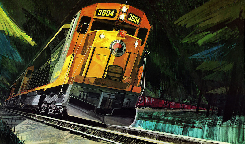 he depicts a 10800-hp consist rolling a manifest along the Clark Fork River in Montana. He also