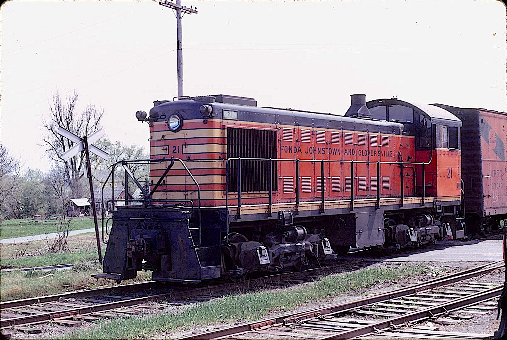 At 9:00 PM, Thursday, April 5, 1968, the Sabo, Custer and Stubblefield Southern dispatched Extra 2206 East into the Detroit-Windsor Tunnel. With a multitude of crew changes, the intrepid voyagers (Ray Sabo, Denny Custer and John Stubblefield) left behind Canada and 2/3 of New York state. The breaking dawn brought arrival at our first stop, at Gloversville, NY for the Fonda Johnstown & Gloversville. FJ&G was all tied up until 9:A.M, but our "19" orders called for tight running all-day. So photos of an Alco switcher were grabbed, and it was off to the next stop at Amsterdam. |