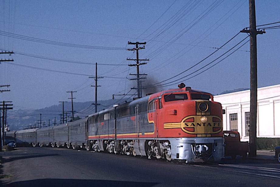 Santa Fe's northbound "Golden Gate" service with PA1 #168 on the point enters Berkeley, California on June 7, 1951. (B.L. Stone photo / Krambles-Peterson Archives).