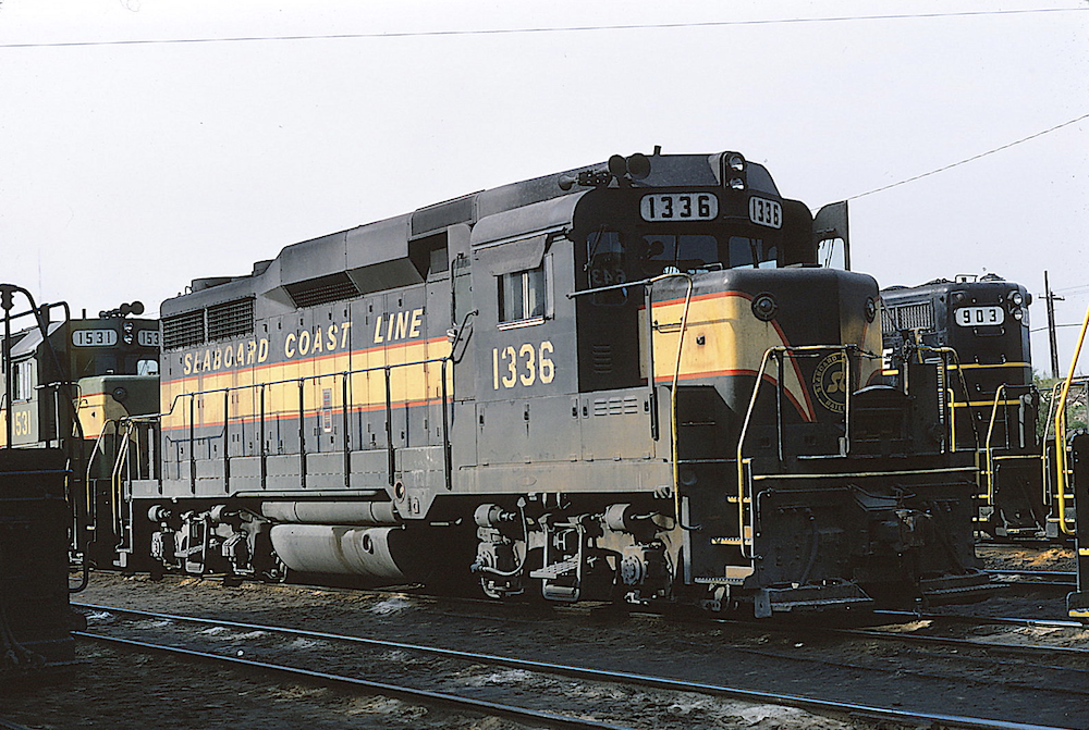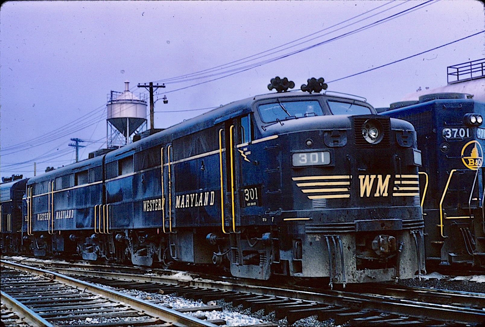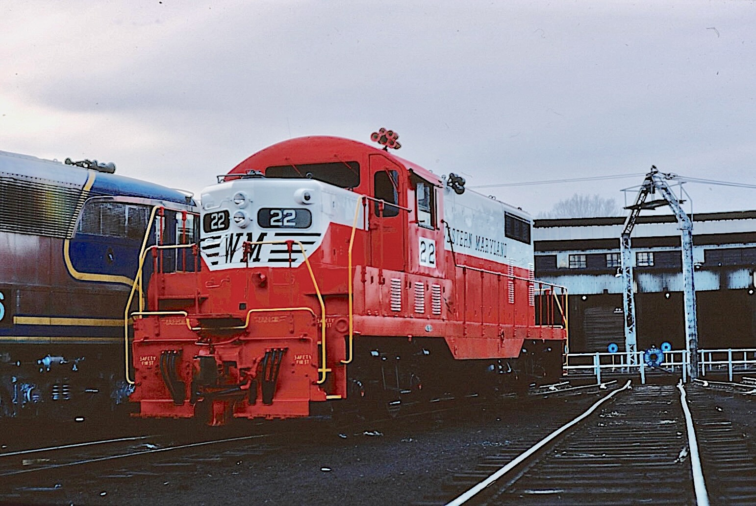 Prior railfan reports had stated that the Delaware & Hudson's Alco PAs were being leased by the Western Maryland. Hence on the way back to Detroit, a stop at the railroad's engine facilities in Cumberland, MD was required (regardless of dark gray clouds and intermitten drizzle which persisted). In addition to the two passenger Alcos, there were also RS3s and a pair of nicely positioned FAs. An EMD-built BL2 was also a pleasant surprise; as was finding one of the "Circus" geeps.  |